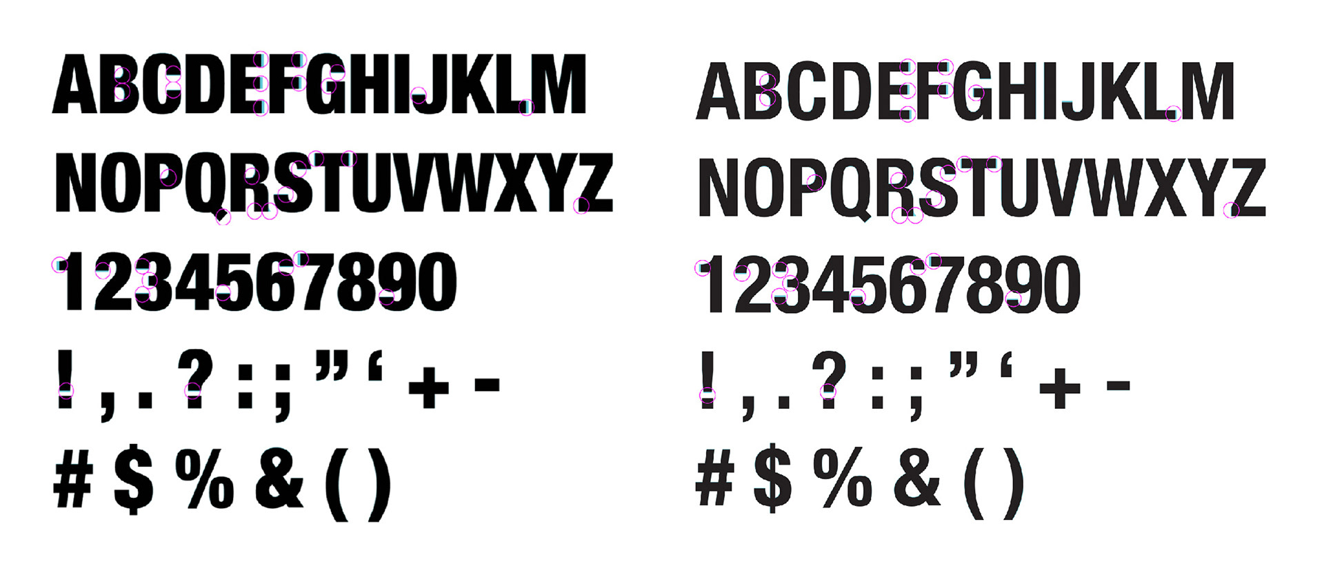 The magenta markups on the lowercase glyphs, highlight the customizations made to the original typeface.
